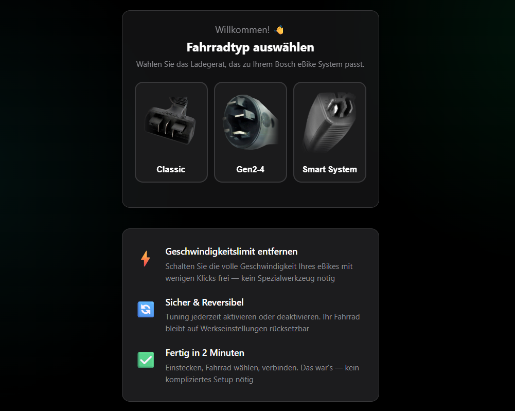 Mehr Geschwindigkeit für dein modernes Bosch Smart System eBike – komplett ohne Motoröffnung, ohne Einbau von Modulen und ohne Werkstattbesuch.