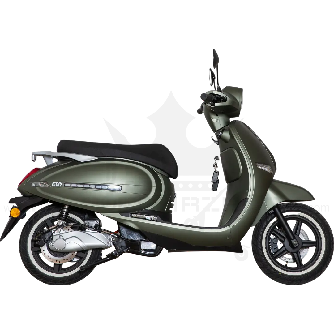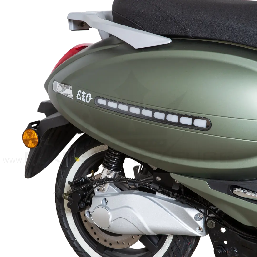 Unter dem Sattel kann ein großer Lithium-Ionen-Akku verstaut werden. Eine hohe Kapazität von 60 Amperestunden bei 72 Volt ermöglicht eine Reichweite von bis zu 120 Kilometern.