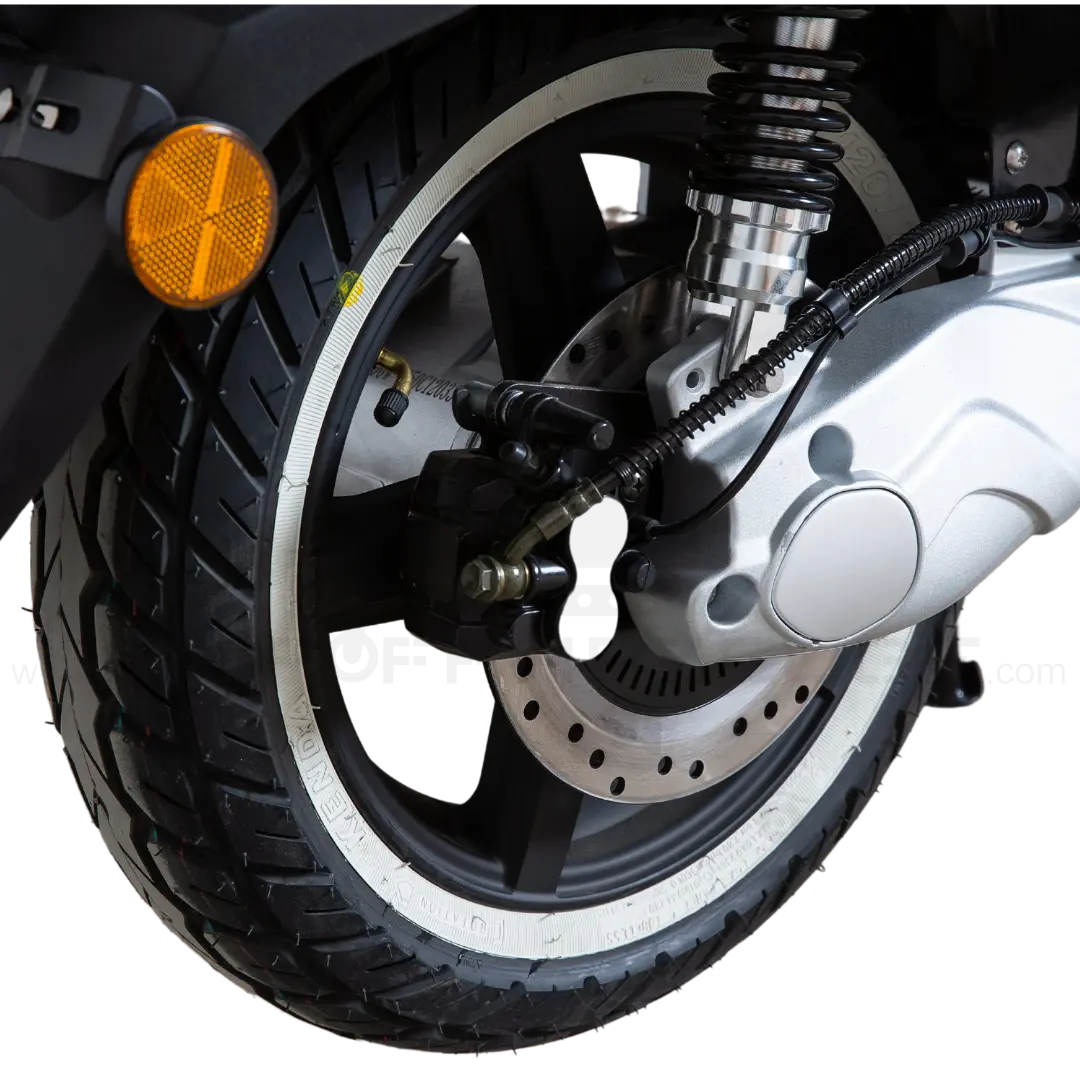 Dank hydraulischer Scheibenbremsen und CBS (Combined Braking System) sowie ABS (Anti Blockier System) bremst der Elektroroller zuverlässig.