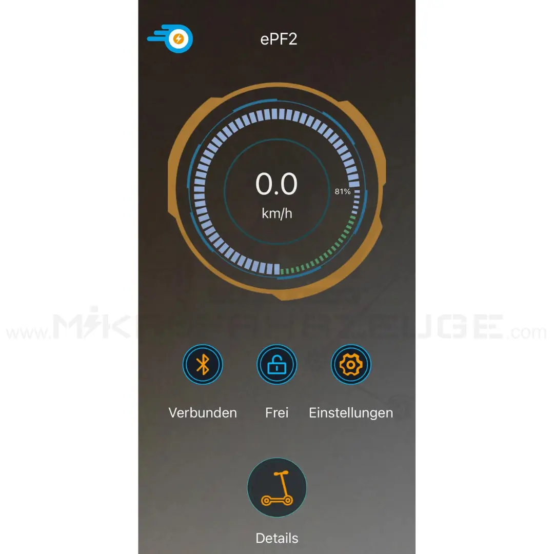 Die ePowerFun App für iOS und Android verleiht Ihrem ePF-2 XT 600 intelligente Funktionen: Überwachen Sie Wegfahrsperre, Batteriestand, Geschwindigkeit, Distanz und passen Sie die Höchstgeschwindigkeit in drei Modi (S: maximale Geschwindigkeit, D: 15 km/h, Eco: 5 km/h) an Ihre Bedürfnisse an.