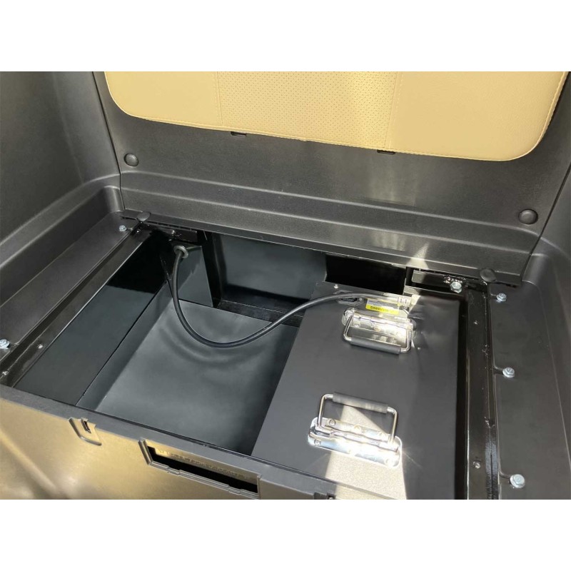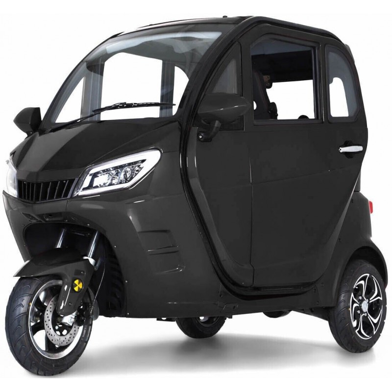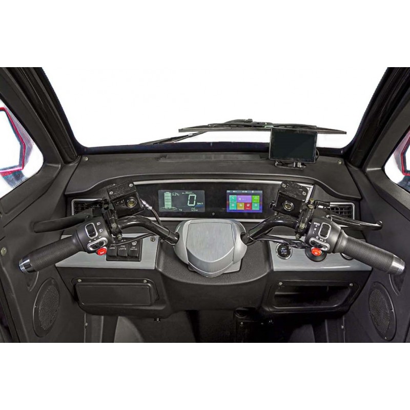 Durch den geschlossenen Kabinenaufbau sind Fahrer und Beifahrer perfekt vor Wind und Wetter geschützt. Der leistungsstarke 2200-Watt-Elektromotor bewältigt Steigungen von bis zu 20 % und sorgt für eine kraftvolle und zuverlässige Fahrt.