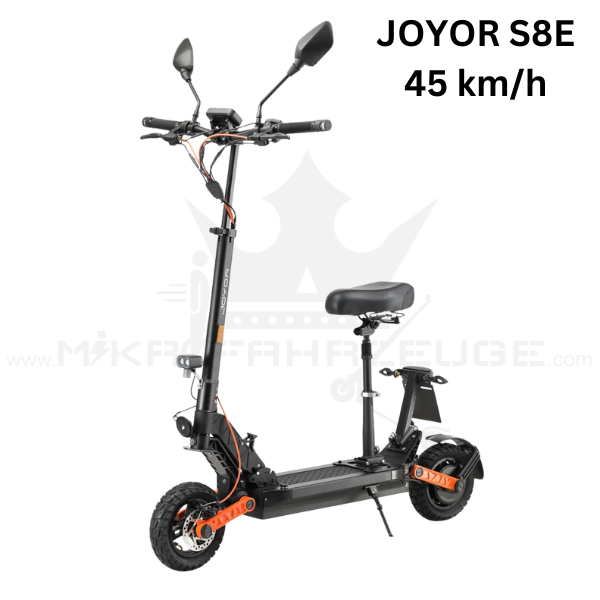 Der Joyor S8E ist mehr als ein E-Scooter – er ist dein verlässlicher Partner für Fahrten in der Stadt und Offroad-Abenteuer. Dank seiner robusten Bauweise, der bequemen Sitzmöglichkeit und der hohen Reichweite erfüllt er alle Ansprüche von Pendlern und Freizeitfahrern. Mit der Straßenzulassung bist du sicher und legal auf allen europäischen Straßen unterwegs.