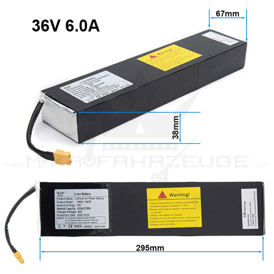 Dieser Akku verfügt über eine Kapazität von 6Ah und eine Spannung von 36V, was für eine ordentliche Leistung und eine angemessene Fahrzeit sorgt. Die Konfiguration besteht aus 10S3P 18650 2000mAh Zellen und einem XT 60-Stecker sowohl für den Download- als auch für den Ladeanschluss.