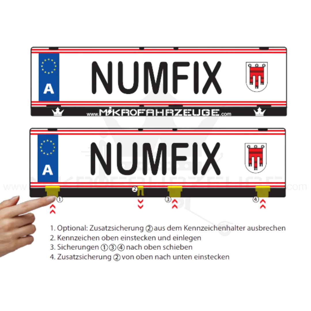 Hinweis: Diese Halterung ist ausschließlich für österreichische Kennzeichen geeignet. Möchtest du einen individuellen Kennzeichenhalter entwerfen? Besuche uns auf www.numfix.eu und lasse dir deinen eigenen Halter gestalten!