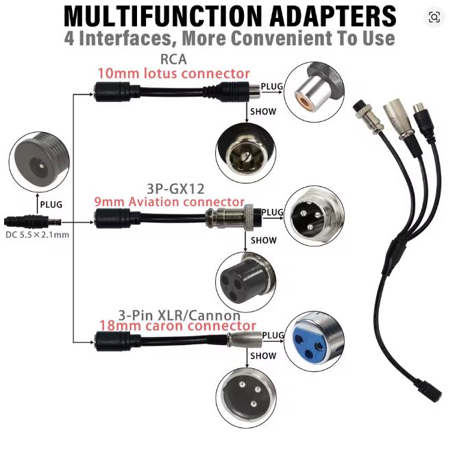 Anschluss: DC5521-Stecker + Adapter auf GX16, XLR und 8mm Rundstecker (im Lieferumfang enthalten)