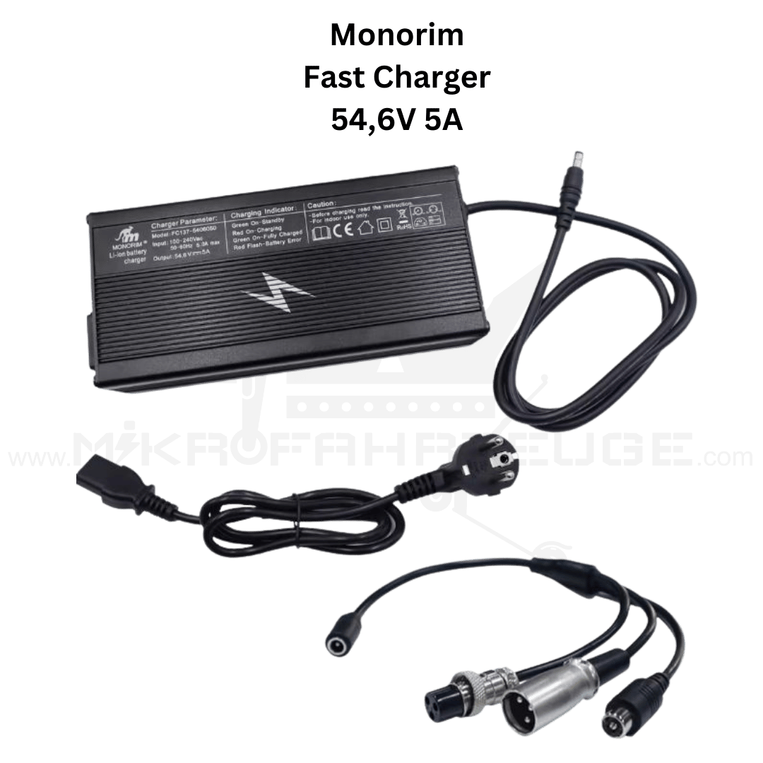 Mit dem Monorim C5A Schnellladegerät laden Sie Ihr 48V Fahrzeug nicht nur schneller, sondern auch sicherer – dank der universellen Adapter passt es auf nahezu alle gängigen Modelle.