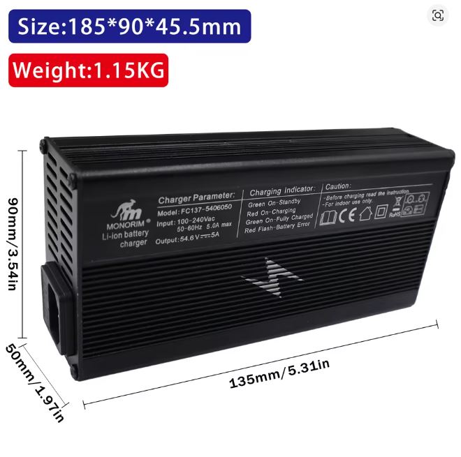 Das Monorim C5A HIGH Schnellladegerät ist die perfekte Lösung, um 48-Volt E-Scooter und E-Bikes schnell, sicher und zuverlässig aufzuladen. Mit einer starken Leistung von 54,6V und 5A verkürzt es die Ladezeit deutlich im Vergleich zu Standard-Ladegeräten und sorgt dafür, dass Ihr Fahrzeug in kürzester Zeit wieder einsatzbereit ist.