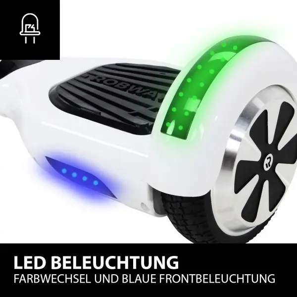 Optisch überzeugt das ROBWAY W1 Hoverboard mit LED-Scheinwerfern und LED-Bändern, die auch in der Nacht für gute Sichtbarkeit sorgen.