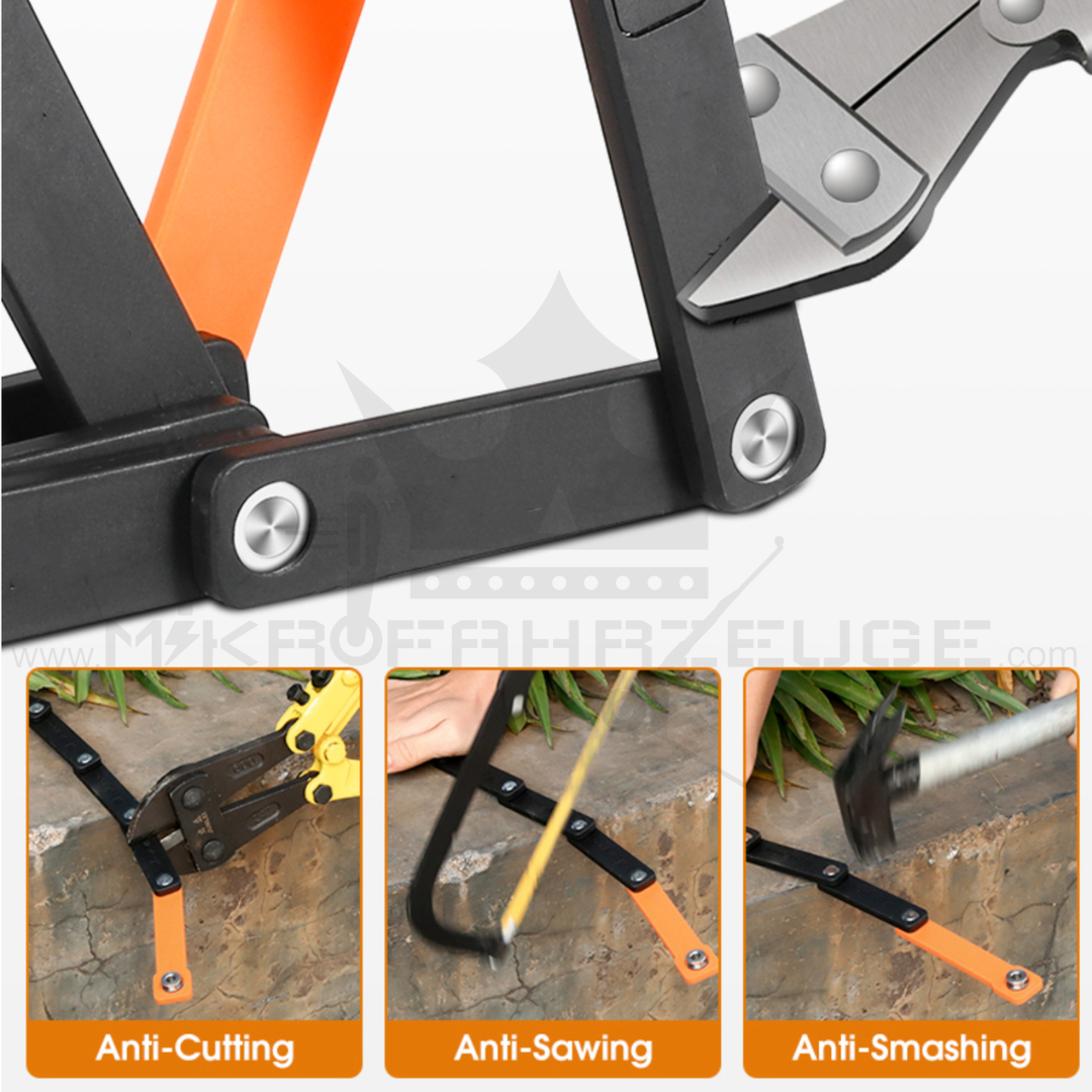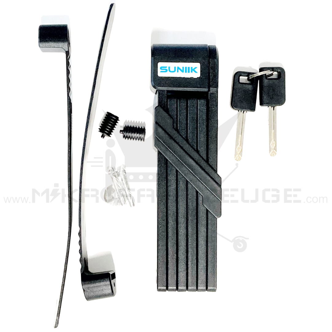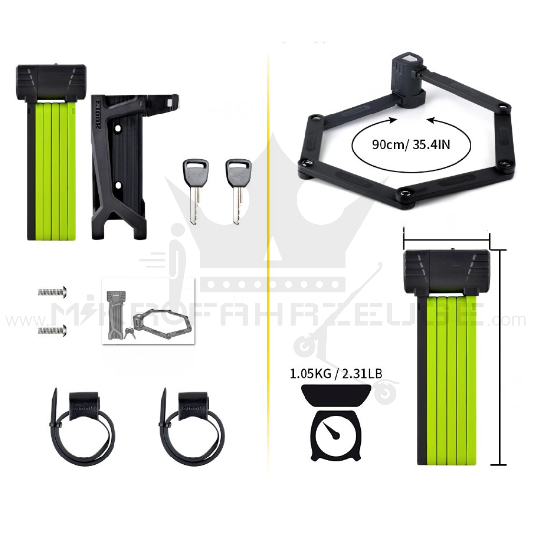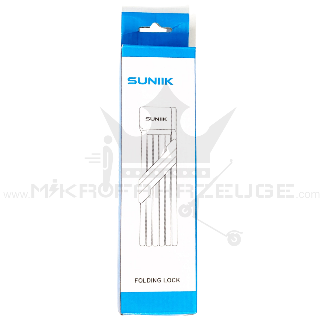 Das Suniik Faltschloss ist ein leichtes und robustes Schloss, das mit einem Gewicht von nur 1,05 kg und einem Umfang von 90 cm sehr handlich ist. Es bietet zusätzlichen Schutz durch seine Anti-Cutting, Anti-Sawing und Anti-Smashing Eigenschaften. Es ist somit eine perfekte Wahl für alle, die auf der Suche nach einem zuverlässigen und tragbaren E Scooter Schloss sind, das sie vor Diebstahl schützt.