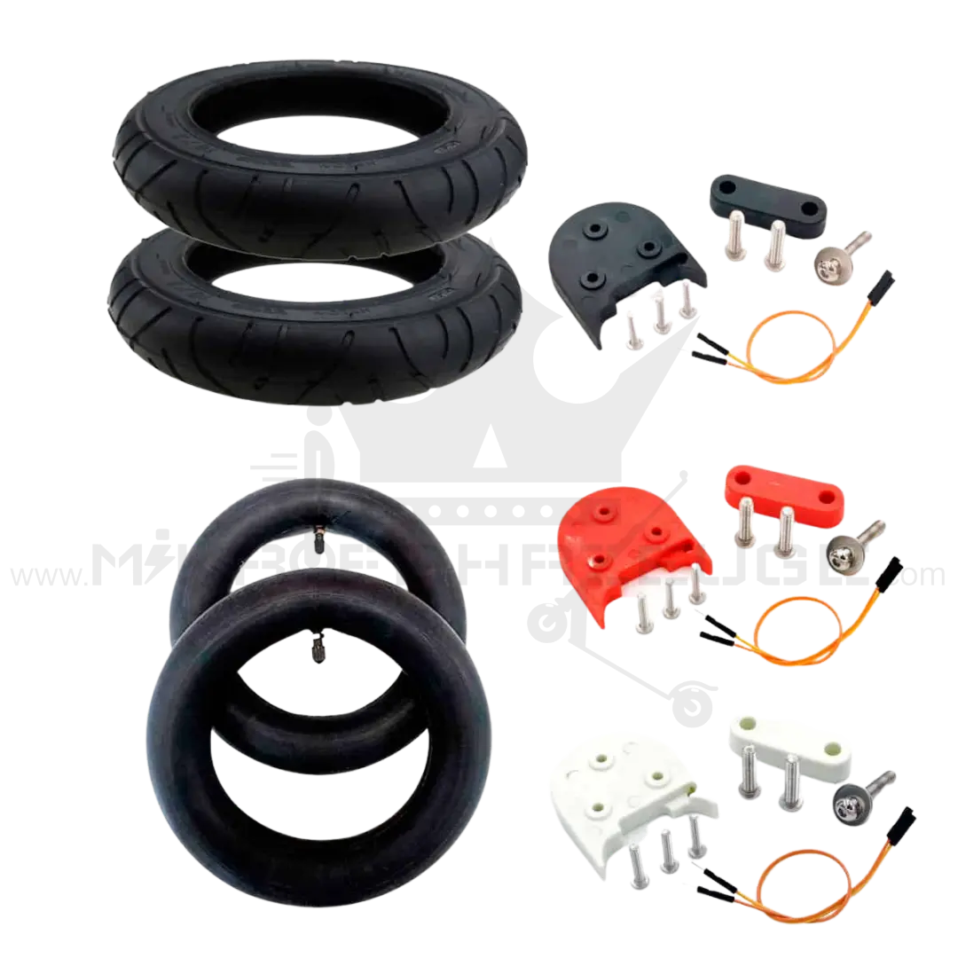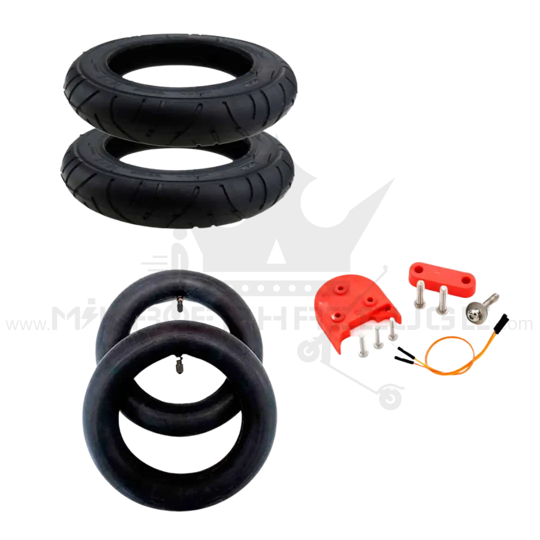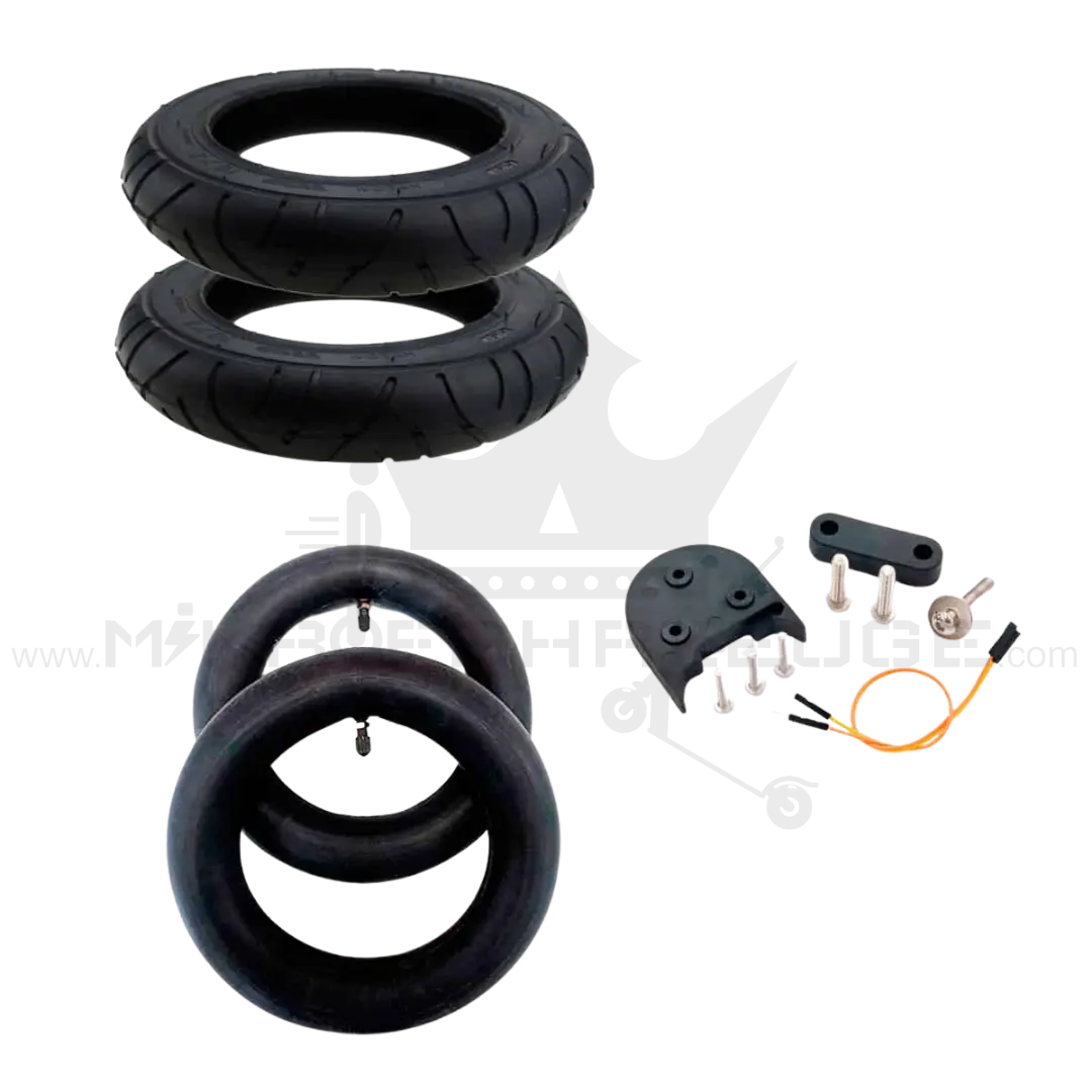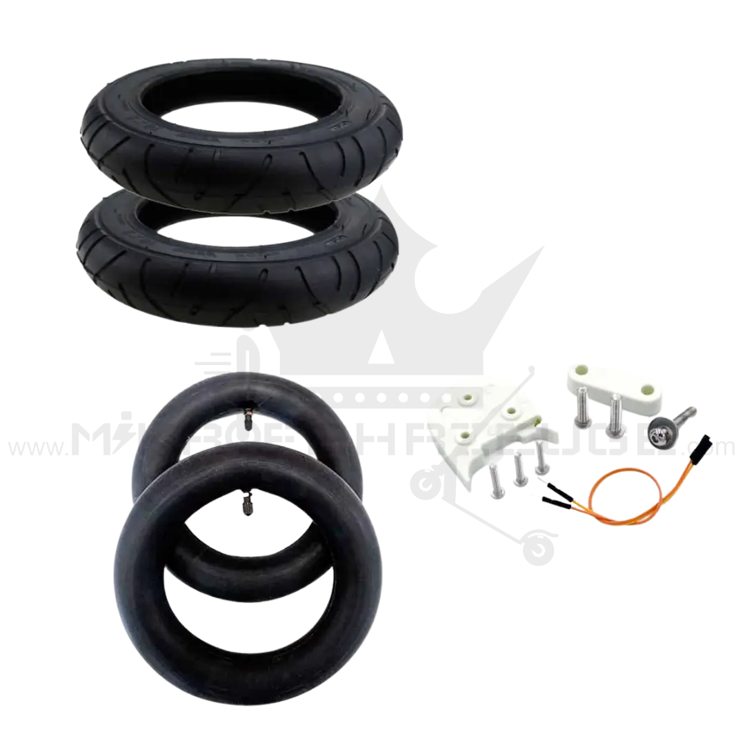 Das Kit enthält 2 x Wanda 10*2 V2-Reifen (je 480 Gramm), 2 x 10-Zoll-Schläuche, 1 x Adapter Set, bestehend aus einem Heckfender-Adapter, einem Seitenständer-Adapter und allen erforderlichen Teilen zur Installation des Kits (einschließlich der passenden Schrauben für die Kotflügel vorne).